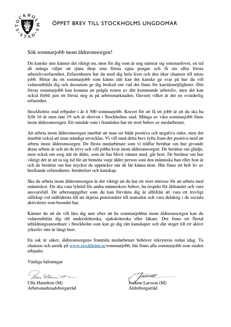 Bifogat finns äldreborgarrådet Joakim Larssons och företagsborgarrådet Ulla Hamiltons Öppna brev om sommarjobb