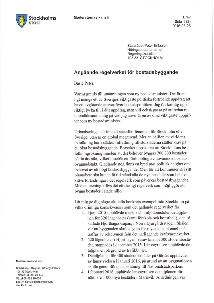 - När Peter Eriksson tillträdde som bostadsminister för ett år sedan passade jag på att skriva ett brev till honom. Det är många viktiga frågor som ligger på hans bord, och bostadsbyggandet är särskilt viktig för en starkt växande region som Stockholm. Men då krävs ett verklighetsanpassat regelverk som faktiskt möjliggör bostäder i täta stadsmiljöer. Jag hoppas att Peter Eriksson väljer att svara på mitt brev, och förklarar vilka insatser som regeringen avser sätta in, fortsätter oppositionsborgarrådet Joakim Larsson (M).