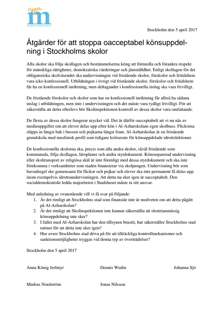 Könsseparerad undervisning eller skoltransport av religiösa skäl får inte förekomma i verksamheter som Stockholms stad finansierar. Det är inte förenligt med skollagen och de styrdokument som slår fast demokrati och jämställdhet. M har idag på kommunstyrelsen lagt en skrivelse där vi kräver att S reder ut varför kontrollen brustit och om det är rimligt att staden finansierar Al-Azharskolan.