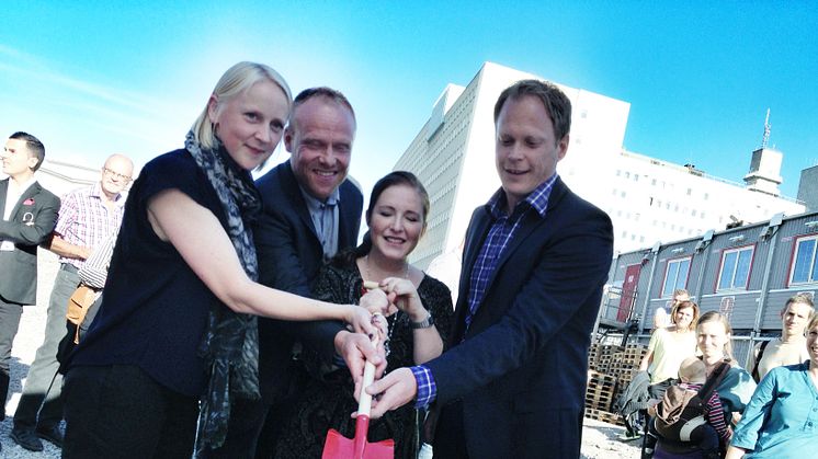 I dag tog stadsbyggnadsborgarrådet Regina Kevius (M) tillsammans med Mi Inkinen och Ola Kjellander, arkitekter på Kjellander + Sjöberg och Mikael Åslund, regionchef JM AB det första spadtaget för 107 nya lägenheter i kvarteret Monoliten på Telefonplan.