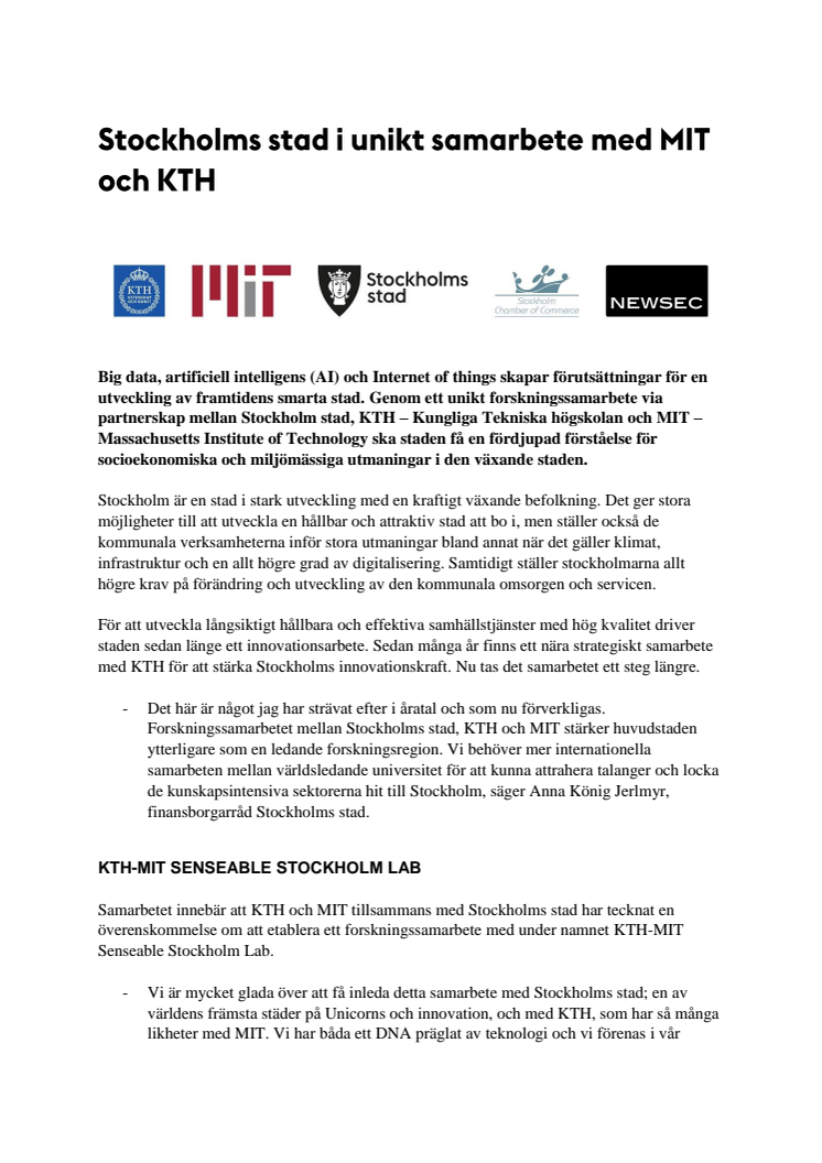 Big data, artificiell intelligens (AI) och Internet of things skapar förutsättningar för en utveckling av framtidens smarta stad. Genom ett unikt forskningssamarbete via partnerskap mellan Stockholm stad, KTH – Kungliga Tekniska högskolan och MIT – Massachusetts Institute of Technology ska staden få en fördjupad förståelse för socioekonomiska och miljömässiga utmaningar i den växande staden.