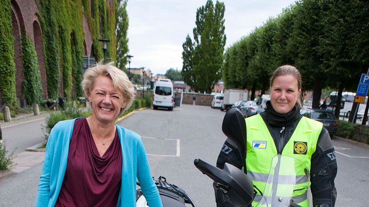 På bilderna Ulla Hamilton (M) med Anna Edler, parkeringsbevakare hos Svensk Bevakningstjänst som kör MC i det nya pilotprojektet, finns för nedladdning på länk: