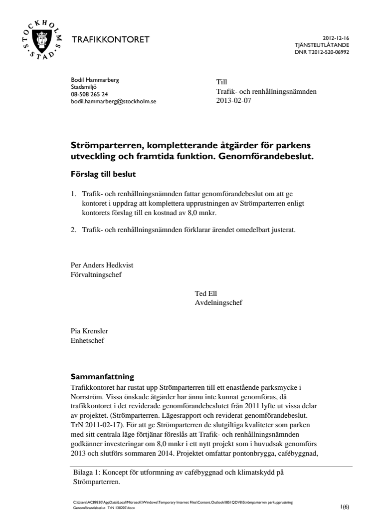 Trafikkontoret har rustat upp Strömparterren i Norrström till en hög parkstandard. För att ge Strömparterren de slutgiltiga kvaliteter som parken med sitt centrala läge förtjänar föreslås att Trafik- och renhållningsnämnden godkänner investeringar om 8,0 mnkr i ett nytt projekt som i huvudsak genomförs 2013 och slutförs sommaren 2014. Projektet omfattar pontonbrygga, cafébyggnad, väderskydd vid uteservering, inglasning av södra valvet, kompletterande utrustning och konstnärlig utsmyckning för barn.