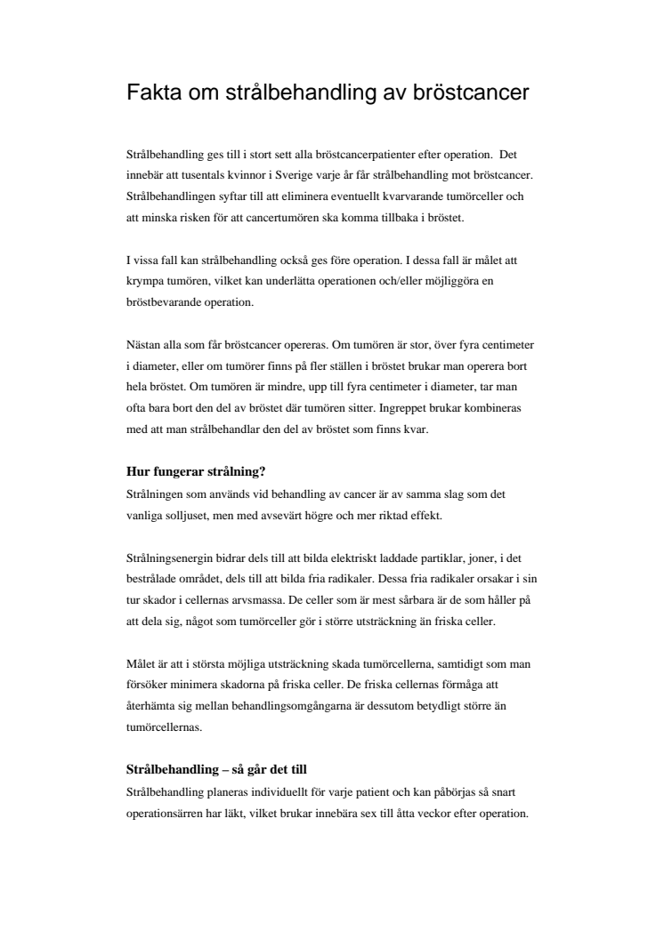 Strålbehandling ges till i stort sett alla bröstcancerpatienter efter operation. Det innebär att tusentals kvinnor i Sverige varje år får strålbehandling mot bröstcancer. Strålbehandlingen syftar till att eliminera eventuellt kvarvarande tumörceller och att minska risken för att cancertumören ska komma tillbaka i bröstet.