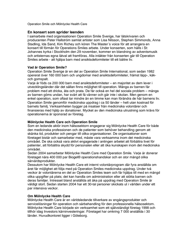 Insamlingsstiftelsen Operation Smile arbetar för att inget barn i världen ska kränkas eller tvingas leva undangömt på grund av en ansiktsdeformitet som går att behandla. Mölnlycke Healthcare stöder Operation Smile sedan 2004 med tid, pengar och produkter som operationshandskar och förband.