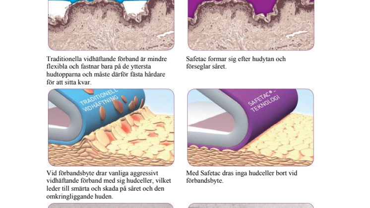 För detta ändamål lämpar sig förband som har ett skikt av mjuk silikon som motverkar att förbanden fastnar i såret vilket minskar smärtan vid förbandsbyten. De bygger på en svensk uppfinning som kallas Safetac.