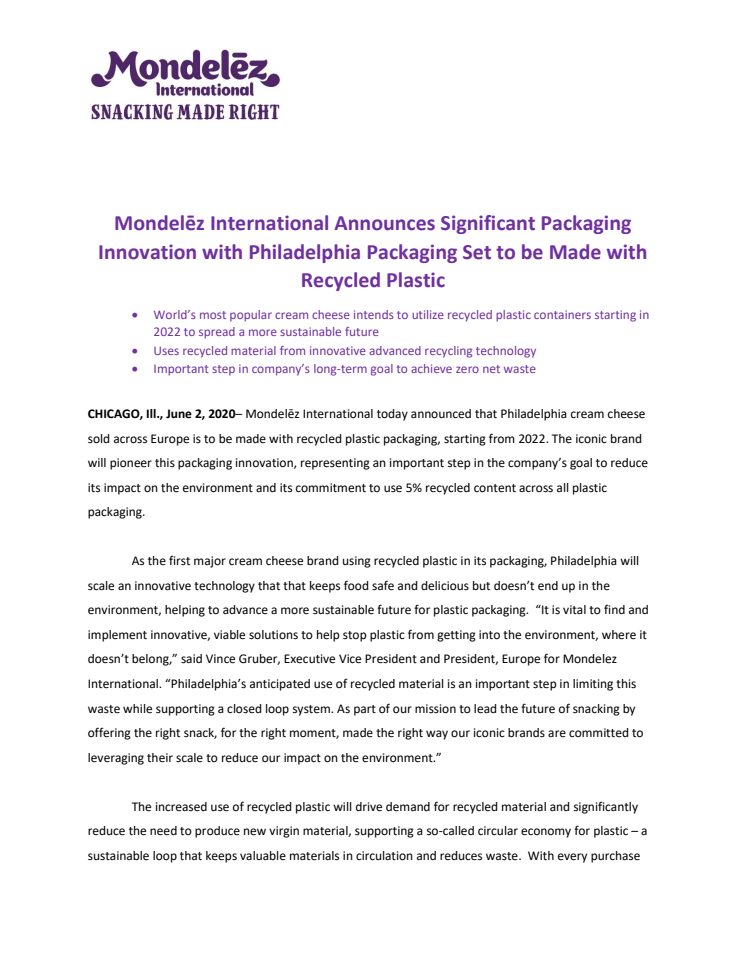 Mondelēz International Announces Significant Packaging Innovation with Philadelphia Packaging Set to be Made with Recycled Plastic