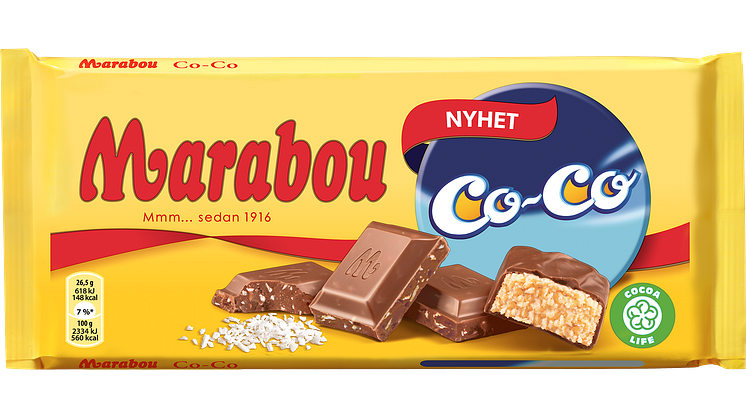 Att förena sina befintliga smaker och med det skapa helt nya koncept har blivit en återkommande framgångssaga för Marabou. Denna gång har den 63 år gamla klassikern Co-Co tagit plats i en ny chokladkaka. Den älskade Marabou mjölkchokladen har fyllts med det bästa av den välkända stycksaken och resultatet blir en chokladkaka med kokosflingor och kolasmak som bjuder på en smakupplevelse väl värd väntan.