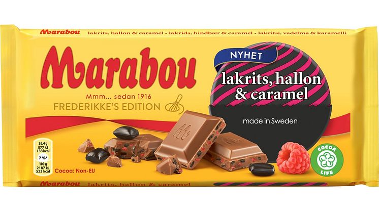 - Marabou lakrits, hallon & caramel är den tredje och sista av smaken som våra konsumenter har hjälpt oss att ta fram. Det är en enastående kombination av vår älskade Marabou mjölkchoklad, saltlakrits, hallon och en hint av karamellsmak. En efterlängtad kombination som många lakritsälskare har efterfrågat! säger Sara Sjöholm, varumärkesansvarig på Marabou.