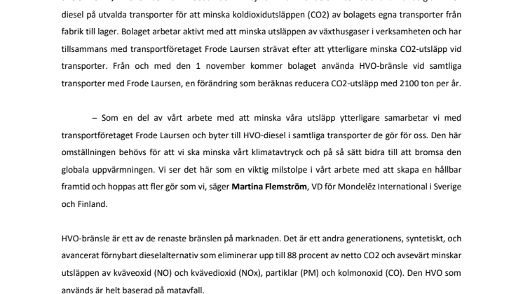 Sedan den 1 maj 2021 har Mondelēz International använt sig av HVO-diesel på utvalda transporter för att minska koldioxidutsläppen (CO2) av bolagets egna transporter från fabrik till lager. Bolaget arbetar aktivt med att minska utsläppen av växthusgaser i verksamheten och har tillsammans med transportföretaget Frode Laursen strävat efter att ytterligare minska CO2-utsläpp vid transporter. Från och med den 1 november kommer bolaget använda HVO-bränsle vid samtliga transporter med Frode Laursen, en förändring som beräknas reducera CO2-utsläpp med 2100 ton per år.