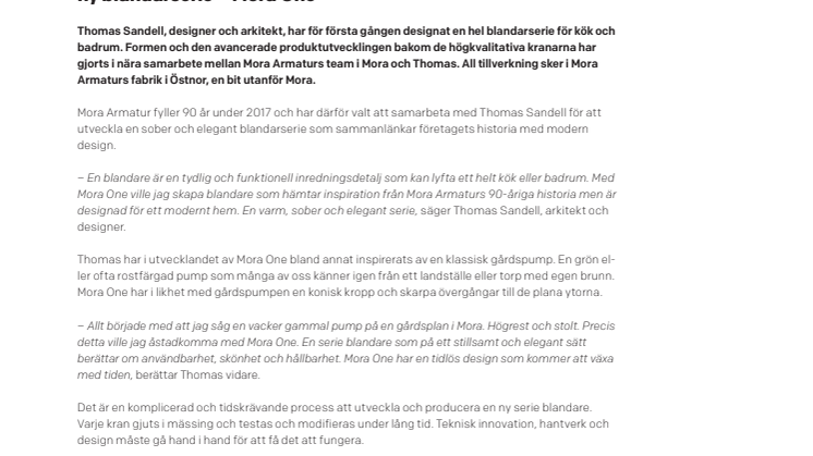 – Thomas Sandell är en designer och arkitekt med stor och gedigen kunskap om vad människor söker och drömmer om när de skapar ett nytt hem. Detta i kombination med en stor förståelse för Mora Armaturs historik och avancerade produktion har resulterat i ett spännande samarbete som vi är mycket stolta över, säger Frank Rälg, produktchef Mora Armatur.