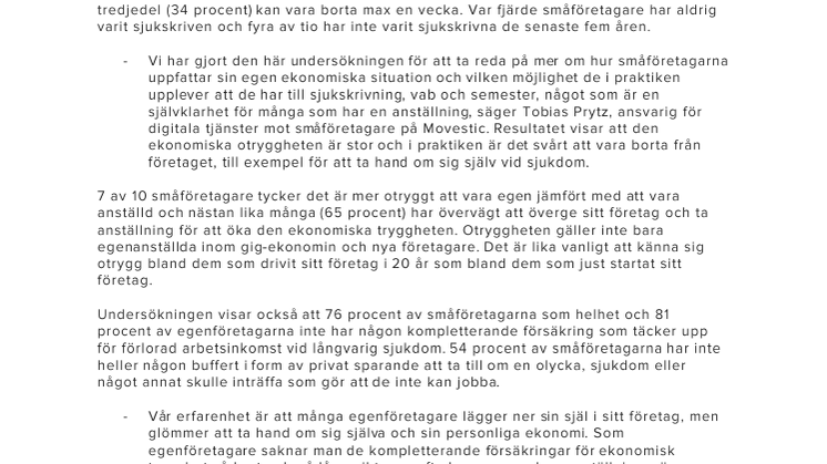 - Vi har gjort den här undersökningen för att ta reda på mer om hur småföretagarna uppfattar sin egen ekonomiska situation och vilken möjlighet de i praktiken upplever att de har till sjukskrivning, vab och semester, något som är en självklarhet för många som har en anställning, säger Tobias Prytz, ansvarig för digitala tjänster mot småföretagare på Movestic. Resultatet visar att den ekonomiska otryggheten är stor och i praktiken är det svårt att vara borta från företaget, till exempel för att ta hand om sig själv vid sjukdom.
