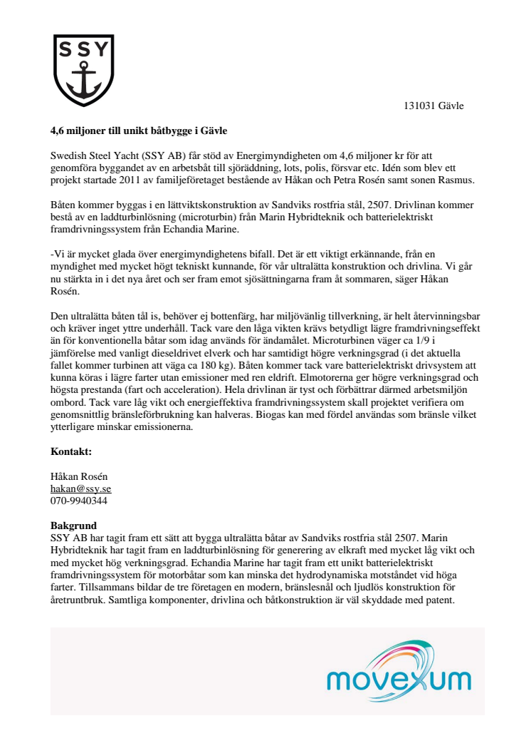 Swedish Steel Yacht (SSY AB) får stöd av Energimyndigheten om 4,6 miljoner kr för att genomföra byggandet av en arbetsbåt till sjöräddning, lots, polis, försvar etc. Idén som blev ett projekt startade 2011 av familjeföretaget bestående av Håkan och Petra Rosén samt sonen Rasmus.