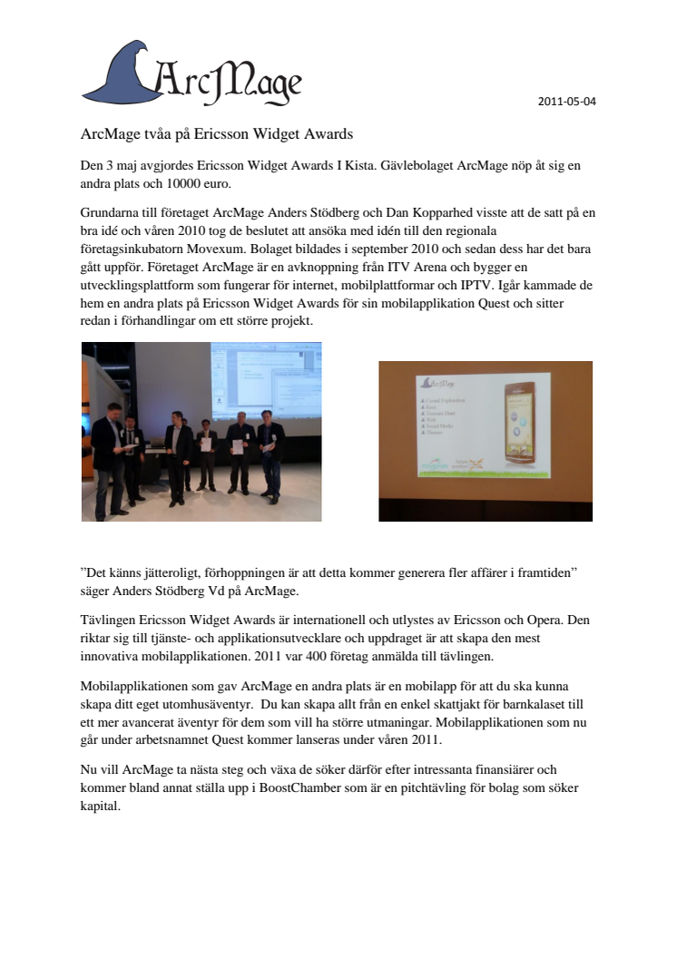 Den 3 maj avgjordes Ericsson Widget Awards I Kista. Gävlebolaget ArcMage nöp åt sig en andra plats och 10000 euro.