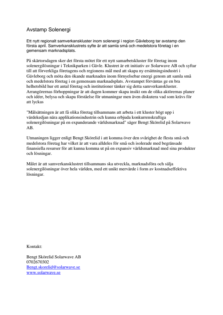 Ett nytt regionalt samverkanskluster inom solenergi i region Gävleborg tar avstamp den första april. Samverkansklustrets syfte är att samla små och medelstora företag i en gemensam marknadsplats