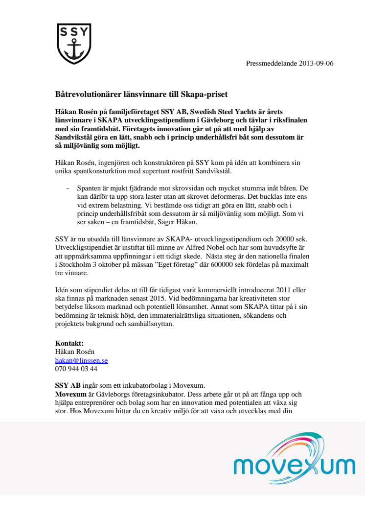 Håkan Rosén på familjeföretaget SSY AB, Swedish Steel Yachts är årets länsvinnare i SKAPA utvecklingsstipendium i Gävleborg och tävlar i riksfinalen med sin framtidsbåt. Företagets innovation går ut på att med hjälp av Sandvikstål göra en lätt, snabb och i princip underhållsfri båt som dessutom är så miljövänlig som möjligt.