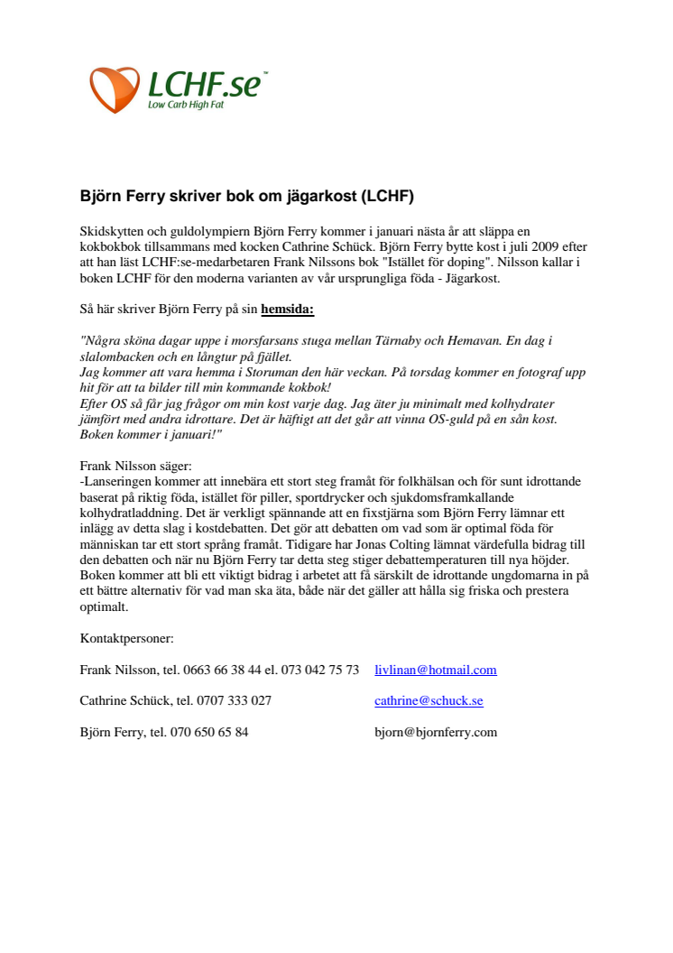 Skidskytten och guldolympiern Björn Ferry kommer i januari nästa år att släppa en kokbokbok tillsammans med kocken Cathrine Schück. Björn Ferry bytte kost i juli 2009 efter att han läst LCHF:se-medarbetaren Frank Nilssons bok "Istället för doping". Nilsson kallar i boken LCHF för den moderna varianten av vår ursprungliga föda - Jägarkost.