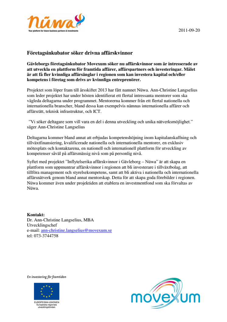 Gävleborgs företagsinkubator Movexum söker nu affärskvinnor som är intresserade av att utveckla en plattform för framtida affärer, affärspartners och investeringar. Målet är att få fler kvinnliga affärsänglar i regionen som kan investera kapital och/eller kompetens i företag som drivs av kvinnliga entreprenörer.