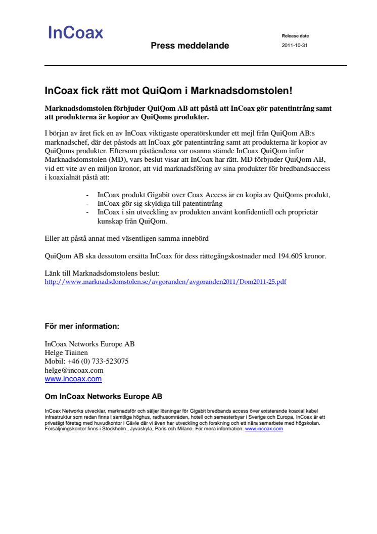 Marknadsdomstolen förbjuder QuiQom AB att påstå att InCoax gör patentintrång samt att produkterna är kopior av QuiQoms produkter.