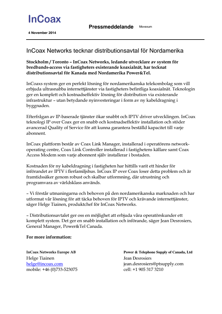 Stockholm / Toronto – InCoax Networks, ledande utvecklare av system för bredbands-access via fastigheters existerande koaxialnät, har tecknat distributionsavtal för Kanada med Nordamerika Power&Tel.