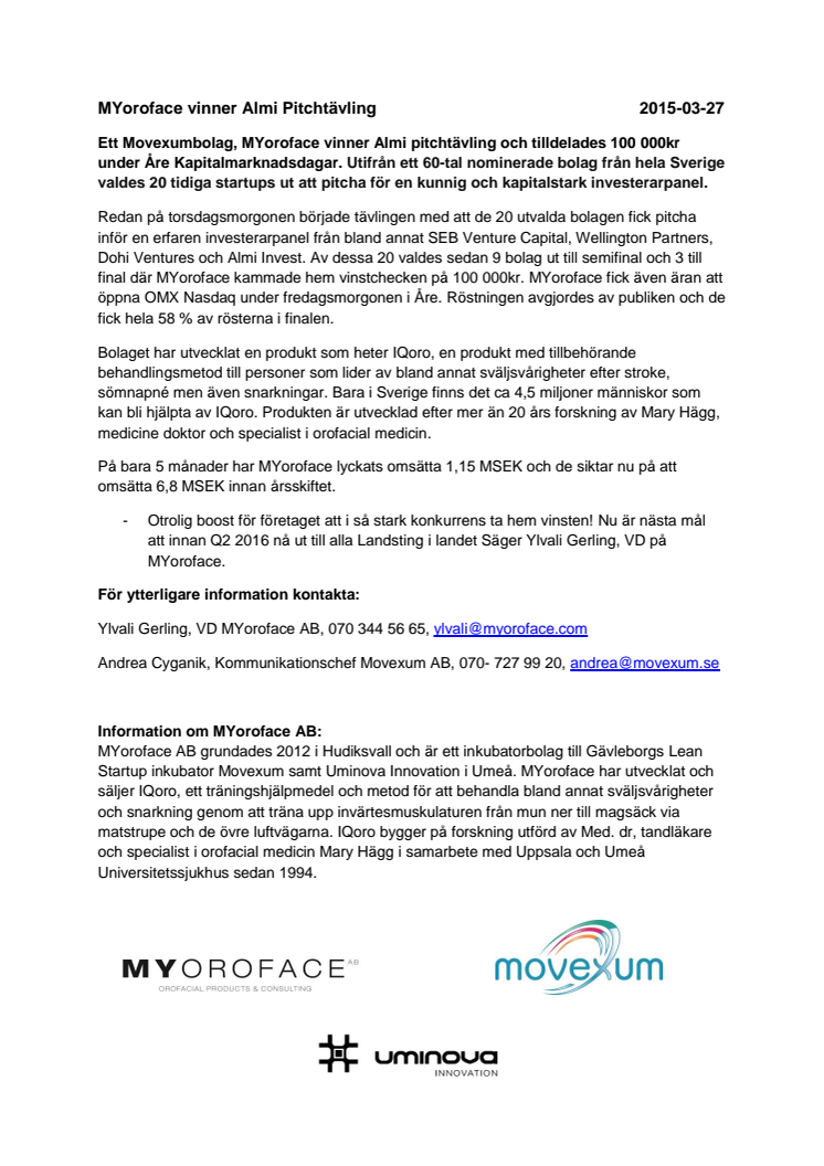 Ett Movexumbolag, MYoroface vinner Almi pitchtävling och tilldelades 100 000kr under Åre Kapitalmarknadsdagar. Utifrån ett 60-tal nominerade bolag från hela Sverige valdes 20 tidiga startups ut att pitcha för en kunnig och kapitalstark investerarpanel