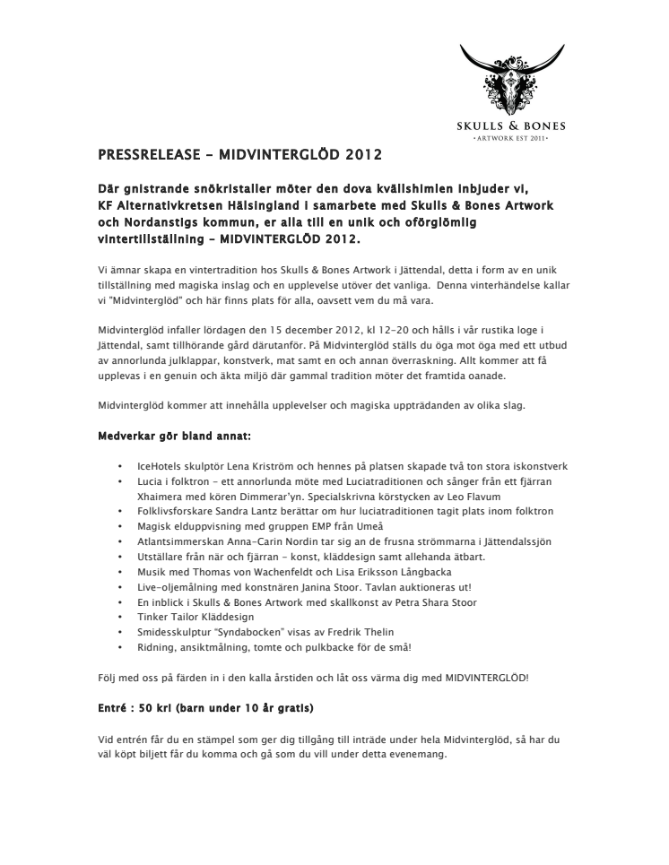 Där gnistrande snökristaller möter den dova kvällshimlen inbjuder, KF Alternativkretsen Hälsingland i samarbete med Skulls & Bones Artwork och Nordanstigs kommun, alla till en unik och oförglömlig vintertillställning – MIDVINTERGLÖD 2012.