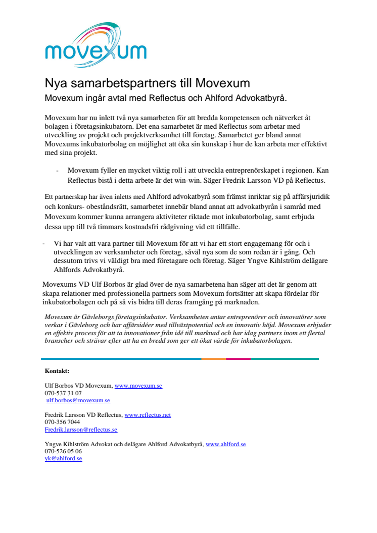Movexum ingår avtal med Reflectus och Ahlford Advokatbyrå.