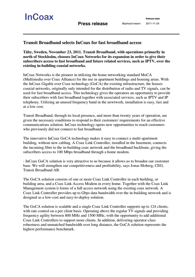 Transit Broadband selects InCoax for fast broadband access
