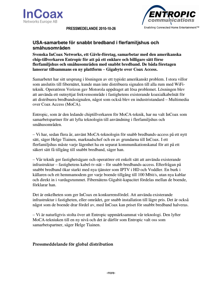 Svenska InCoax Networks, ett Gävle-företag, samarbetar med den amerikanska chip-tillverkaren Entropic för att på ett enklare och billigare sätt förse flerfamiljshus och småhusområden med snabbt bredband. De båda företagen lanserar tillsammans en ny plattform – Gigabyte over Coax Access.