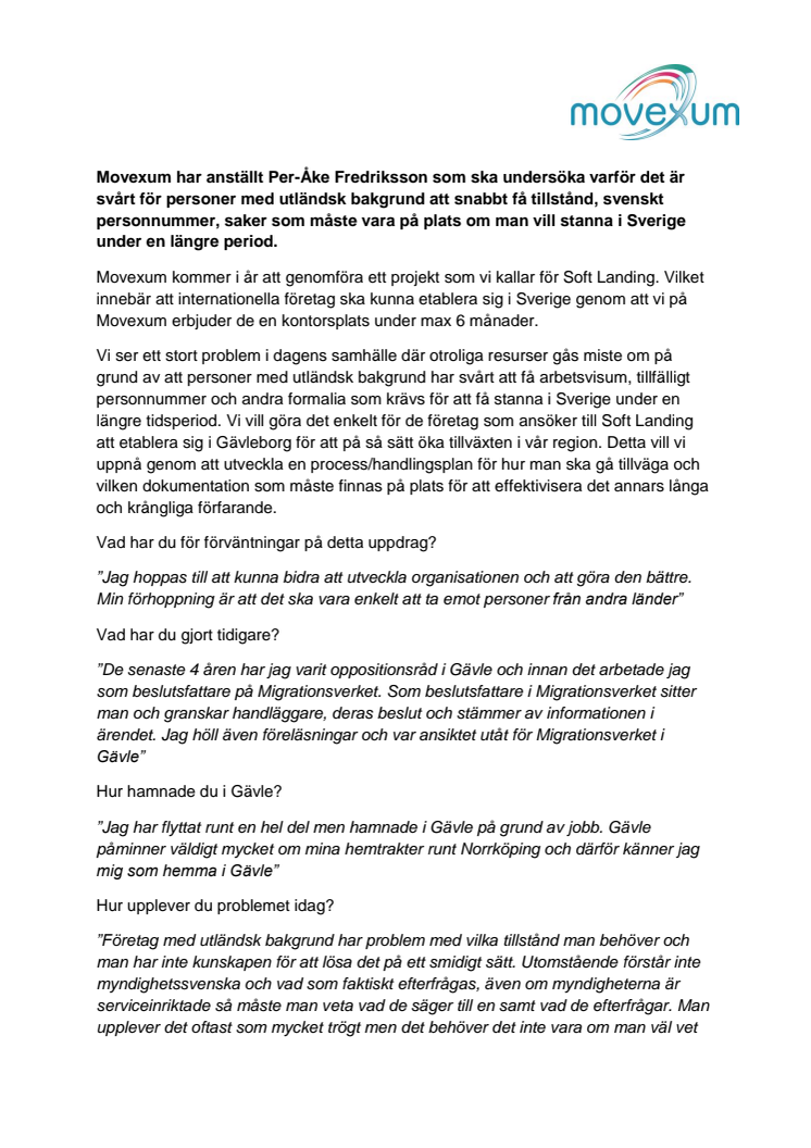 Movexum har anställt Per-Åke Fredriksson som ska undersöka varför det är svårt för personer med utländsk bakgrund att snabbt få tillstånd, svenskt personnummer, saker som måste vara på plats om man vill stanna i Sverige under en längre period.