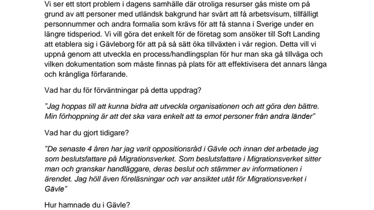 Vi ser ett stort problem i dagens samhälle där otroliga resurser gås miste om på grund av att personer med utländsk bakgrund har svårt att få arbetsvisum, tillfälligt personnummer och andra formalia som krävs för att få stanna i Sverige under en längre tidsperiod. Vi vill göra det enkelt för de företag som ansöker till Soft Landing att etablera sig i Gävleborg för att på så sätt öka tillväxten i vår region. Detta vill vi uppnå genom att utveckla en process/handlingsplan för hur man ska gå tillväga och vilken dokumentation som måste finnas på plats för att effektivisera det annars långa och krångliga förfarande.