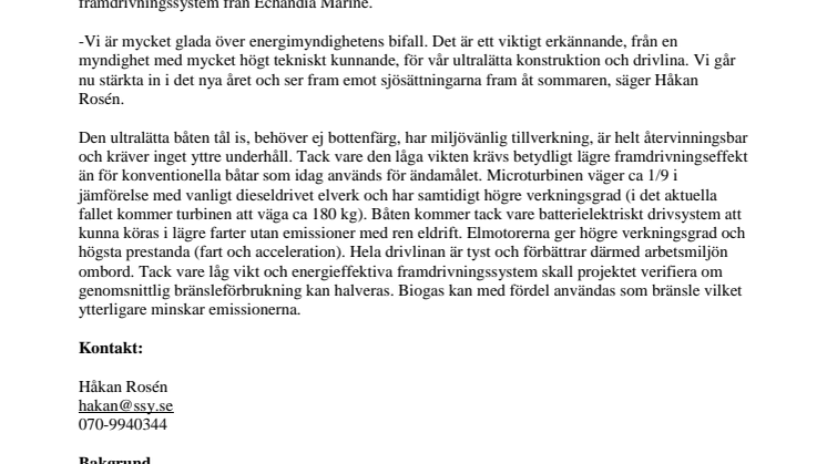 -Vi är mycket glada över energimyndighetens bifall. Det är ett viktigt erkännande, från en myndighet med mycket högt tekniskt kunnande, för vår ultralätta konstruktion och drivlina. Vi går nu stärkta in i det nya året och ser fram emot sjösättningarna fram åt sommaren, säger Håkan Rosén.
