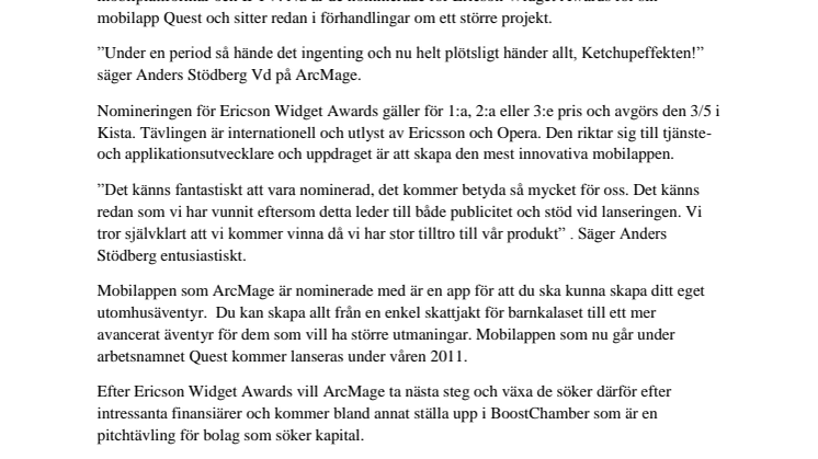 Mobilappen som ArcMage är nominerade med är en app för att du ska kunna skapa ditt eget utomhusäventyr. Du kan skapa allt från en enkel skattjakt för barnkalaset till ett mer avancerat äventyr för dem som vill ha större utmaningar. Mobilappen som nu går under arbetsnamnet Quest kommer lanseras under våren 2011.