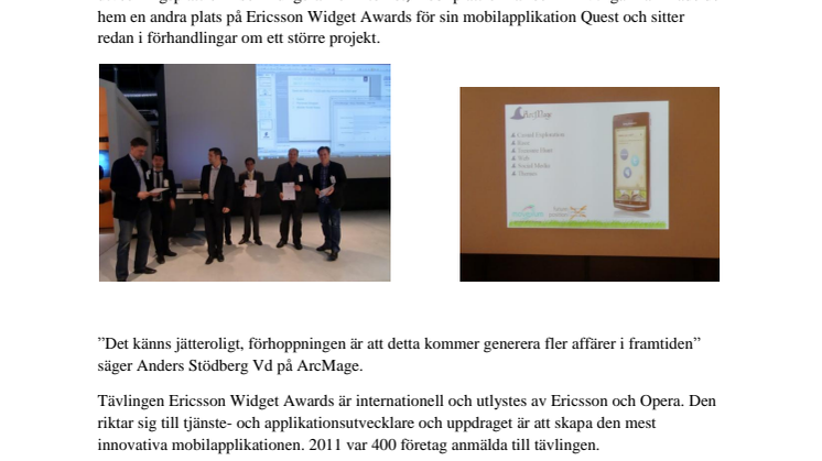 Grundarna till företaget ArcMage Anders Stödberg och Dan Kopparhed visste att de satt på en bra idé och våren 2010 tog de beslutet att ansöka med idén till den regionala företagsinkubatorn Movexum. Bolaget bildades i september 2010 och sedan dess har det bara gått uppför. Företaget ArcMage är en avknoppning från ITV Arena och bygger en utvecklingsplattform som fungerar för internet, mobilplattformar och IPTV. Igår kammade de hem en andra plats på Ericsson Widget Awards för sin mobilapplikation Quest och sitter redan i förhandlingar om ett större projekt.