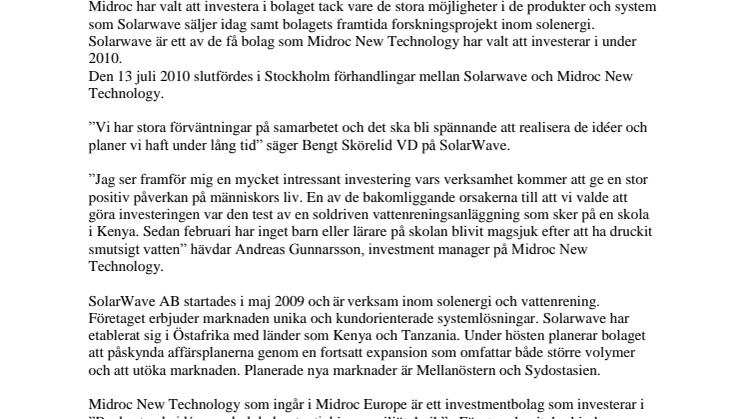 Solarwave AB stärker sina möjligheter att skapa en ny lönsam industri inom solenergi och vattenrening. Investmentbolaget Midroc New Technology AB går in som delägare och finansiär. Samarbetet ger Solarwave den förstärkning som behövs för en fortsatt expansiv utveckling. Midroc har valt att investera i bolaget tack vare de stora möjligheter i de produkter och system som Solarwave säljer idag samt bolagets framtida forskningsprojekt inom solenergi. Solarwave är ett av de få bolag som Midroc New Technology har valt att investerar i under 2010.