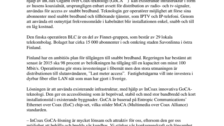– Vi är hedrade av att BLC väljer vår teknologi för nästa generation av sin teknikutveckling, säger Thomas Svensson, VD för InCoax Networks. Vi är övertygade om att vår funktionsfyllda GoCA-lösning ska framtidssäkra deras bandbreddsbehov och ge dem möjligt att leverera IP-baserade premium-tjänster. Vår teknologi passar de finska operatörerna i övergången till nästa generations snabba bredband, tillägger Thomas.