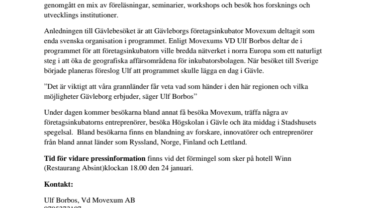 Den 24 januari kommer projektet Emerging Innovation in Northen Europe Programme till Gävle. Programmet har tagits fram av nordiska ministerrådet för att öka nätverket och samarbetet gällande innovationer i norra Europa. Programmet syftar till att öka kunskapen hos deltagarna gällande innovation, entreprenörskap i innovationssfären, och den nordiska och nordvästryska marknaden. Under programmet som startades i september 2010 har deltagarna genomgått en mix av föreläsningar, seminarier, workshops och besök hos forsknings och utvecklings institutioner.