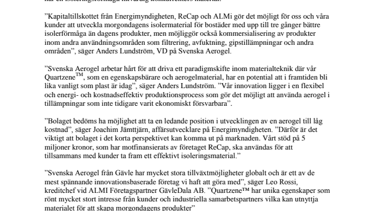 ”Svenska Aerogel från Gävle har mycket stora tillväxtmöjligheter globalt och är ett av de mest spännande innovationsbaserade företag vi haft att göra med”, säger Leo Rossi, kreditchef vid ALMI Företagspartner GävleDala AB. ”Quartzene™ har unika egenskaper som rönt mycket stort intresse från kunder och industriella samarbetspartners vilka kan utnyttja materialet för att skapa morgondagens produkter”