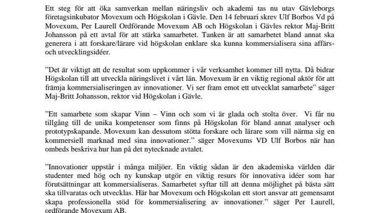 Ett steg för att öka samverkan mellan näringsliv och akademi tas nu utav Gävleborgs företagsinkubator Movexum och Högskolan i Gävle. Den 14 februari skrev Ulf Borbos Vd på Movexum, Per Laurell Ordförande Movexum AB och Högskolan i Gävles rektor Maj-Britt Johansson på ett avtal för att stärka samarbetet. Tanken är att samarbetet bland annat ska generera i att forskare/lärare vid högskolan enklare ska kunna kommersialisera sina affärs- och utvecklingsidéer.