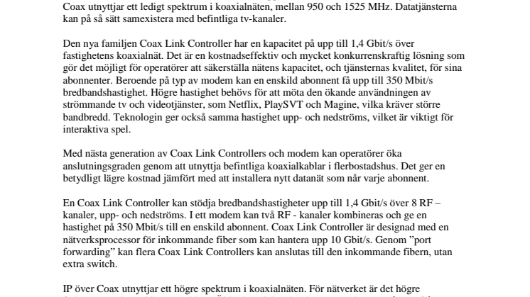 Den nya familjen Coax Link Controller har en kapacitet på upp till 1,4 Gbit/s över fastighetens koaxialnät. Det är en kostnadseffektiv och mycket konkurrenskraftig lösning som gör det möjligt för operatörer att säkerställa nätens kapacitet, och tjänsternas kvalitet, för sina abonnenter. Beroende på typ av modem kan en enskild abonnent få upp till 350 Mbit/s bredbandshastighet. Högre hastighet behövs för att möta den ökande användningen av strömmande tv och videotjänster, som Netflix, PlaySVT och Magine, vilka kräver större bandbredd. Teknologin ger också samma hastighet upp- och nedströms, vilket är viktigt för interaktiva spel.