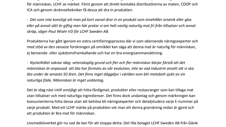 Det är idag näst intill omöjligt att hitta färdigmat, produkter eller restauranger som kan tillaga mat utan tillsatser och med naturliga ingredienser. Det finns dock undantag och genom märkningen kan konsumenterna hitta dessa utan att behöva bli näringsexperter och detaljstudera varje E-nummer på varje produkt. Med ett LCHF märke på produkten vet man att denna granskning redan är gjord och att produkten är Bra mat för människan.