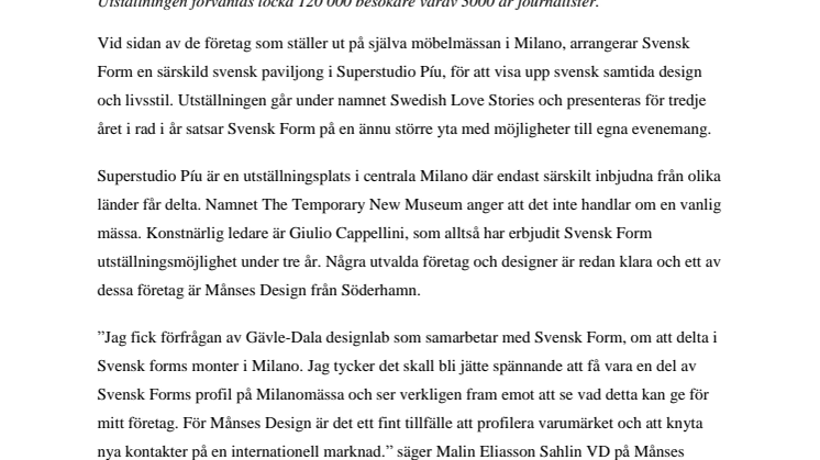 Superstudio Píu är en utställningsplats i centrala Milano där endast särskilt inbjudna från olika länder får delta. Namnet The Temporary New Museum anger att det inte handlar om en vanlig mässa. Konstnärlig ledare är Giulio Cappellini, som alltså har erbjudit Svensk Form utställningsmöjlighet under tre år. Några utvalda företag och designer är redan klara och ett av dessa företag är Månses Design från Söderhamn.