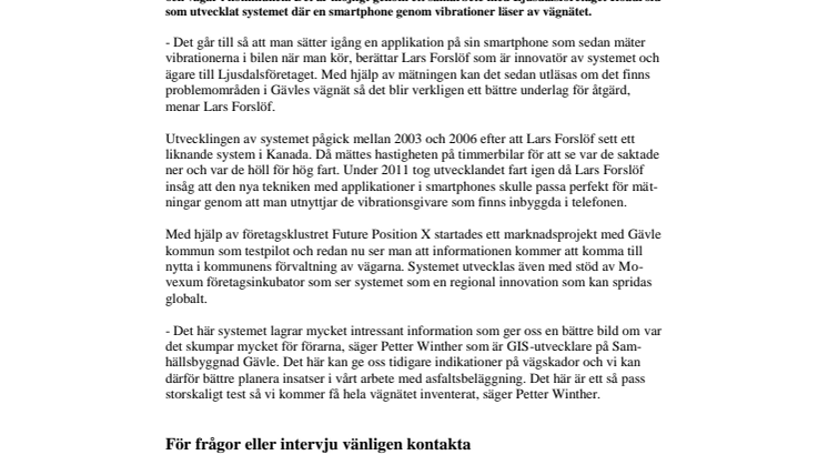 - Det går till så att man sätter igång en applikation på sin smartphone som sedan mäter vibrationerna i bilen när man kör, berättar Lars Forslöf som är innovatör av systemet och ägare till Ljusdalsföretaget. Med hjälp av mätningen kan det sedan utläsas om det finns problemområden i Gävles vägnät så det blir verkligen ett bättre underlag för åtgärd, menar Lars Forslöf.