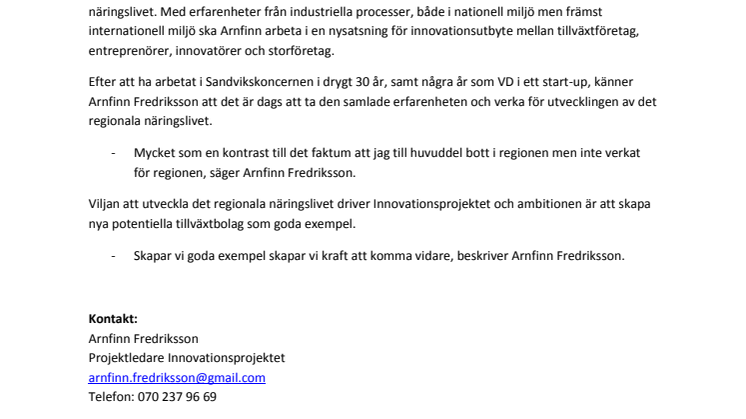 Arnfinn Fredriksson är projektledaren som ska skapa nya innovationsutbyten för det regionala näringslivet. Med erfarenheter från industriella processer, både i nationell miljö men främst internationell miljö ska Arnfinn arbeta i en nysatsning för innovationsutbyte mellan tillväxtföretag, entreprenörer, innovatörer och storföretag.
