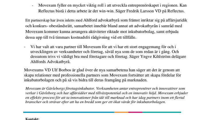 Movexum har nu inlett två nya samarbeten för att bredda kompetensen och nätverket åt bolagen i företagsinkubatorn. Det ena samarbetet är med Reflectus som arbetar med utveckling av projekt och projektverksamhet till företag. Samarbetet ger bland annat Movexums inkubatorbolag en möjlighet att öka sin kunskap i hur de kan arbeta mer effektivt med sina projekt.