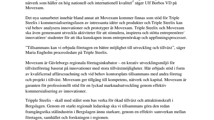 Movexum och Triple Steelix har nu tecknat avtal för att erbjuda den lokala och regionala marknaden ännu större tillgång till kunskap, kompetens och nätverk vilket i sin tur kommer stärka konkurrenskraften i regionen.