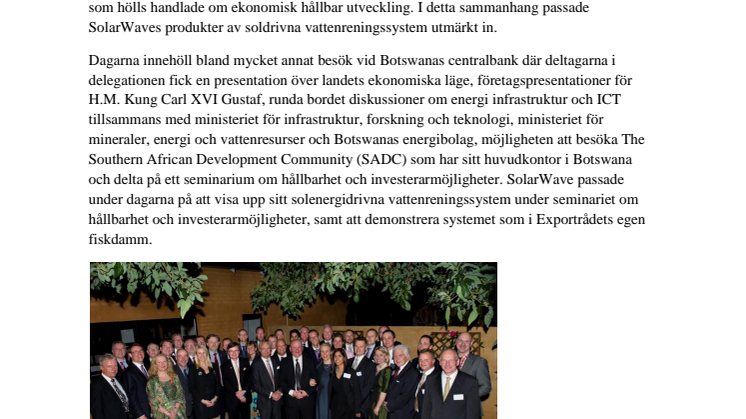 I samband med H.M. Kung Carl XVI Gustaf statsbesök i Botswana den 22 -25 mars blev Solarwave AB tillsammans med 25 andra svenska företag och organisationer inbjudna att följa med i den svenska handelsdelegationen. Delegationen bestod av bland andra ABB, Atlas Copco, Ericson, Sandvik, Volvo, Scania samt flera andra företag. Syftet med statsbesöket var att gynna affärsförhållanden mellan Sverige och Botswana, och stora delar av de diskussioner som hölls handlade om ekonomisk hållbar utveckling. I detta sammanhang passade SolarWaves produkter av soldrivna vattenreningssystem utmärkt in.