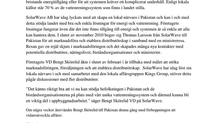 SolarWave AB har idag lyckats med att skapa en lokal närvaro i Pakistan och kan i och med detta stödja landet med bra och enkla lösningar för energi och vattenrening. Företagets lösningar fungerar även där det inte finns tillgång till energi och systemen är så enkla att alla kan hantera dem. I slutet av november 2010 begav sig Thomas Larsson från SolarWave till Pakistan för att marknadsföra och etablera distributörskap i samband med en ministerresa. Resan gav en rejäl skjuts i marknadsföringen och det skapades många nya kontakter med potentiella distributörer, näringslivet, biståndsorganisationer och ministerier.