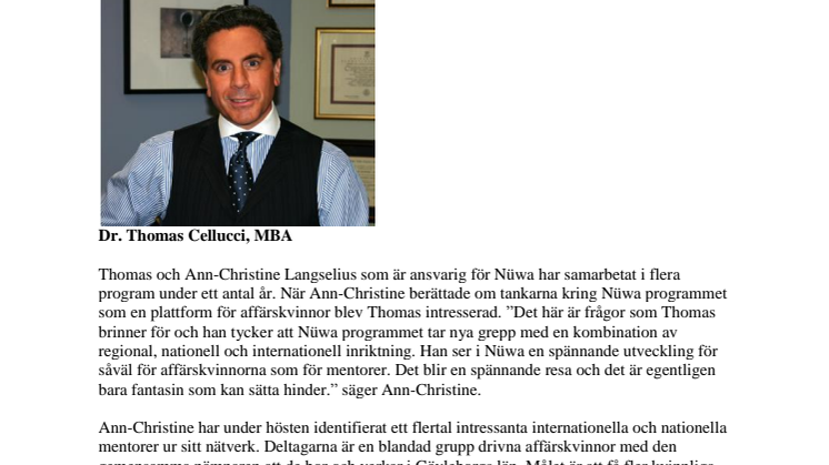 Thomas och Ann-Christine Langselius som är ansvarig för Nüwa har samarbetat i flera program under ett antal år. När Ann-Christine berättade om tankarna kring Nüwa programmet som en plattform för affärskvinnor blev Thomas intresserad. ”Det här är frågor som Thomas brinner för och han tycker att Nüwa programmet tar nya grepp med en kombination av regional, nationell och internationell inriktning. Han ser i Nüwa en spännande utveckling för såväl för affärskvinnorna som för mentorer. Det blir en spännande resa och det är egentligen bara fantasin som kan sätta hinder.” säger Ann-Christine.