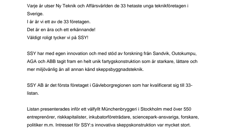 I dag den 14 april 2015 har vi nöjet att meddela att vi, SSY AB är ett av företagen som valts ut till Ny tekniks och Affärsvärldens 33-lista.